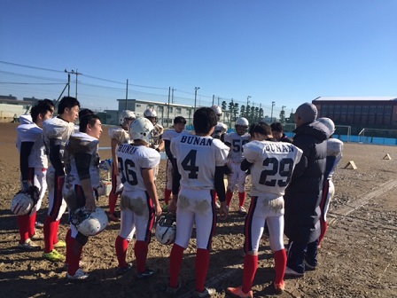 2月7日 花咲栄高校と練習試合をさせていただきました。前日降った雪の影響で、足場が悪く自分たちの練習してきたプレーができるか心配でしたが、なんとかできる限りのことをやってきました。やっぱり試合は面白いです。僕は中学時代、科学部に所属しながら市の柔道教室で柔道を教わっていました。武南高校に入学した時は、柔道部に入るか新しいスポーツを始めるか悩んでいたのですが、アメフト部の優しい先輩の勧誘をきっかけに、部活動見学にいきました。専門的に細かく丁寧に教えてくれる顧問の先生もいて、ルールなど一切分かりませんでしたが、不安は感じませんでした。今まで人にタックルする事などなかったけれど、これが予想外に楽しいです!チームが有利になるように敵陣で相手を倒したときは、今まで体感したことのないような盛り上がり方で仲間が喜んでくれます!自分の活躍がチームの役に立っていると実感できる瞬間です!!全員初心者から始めているので足並みがそろった状態で入部できたせいか、先輩はもちろん、同じ学年の仲間はものすごく仲がいいです。互いを高め合うライバルとしても!要するにアメフト部最高です!!