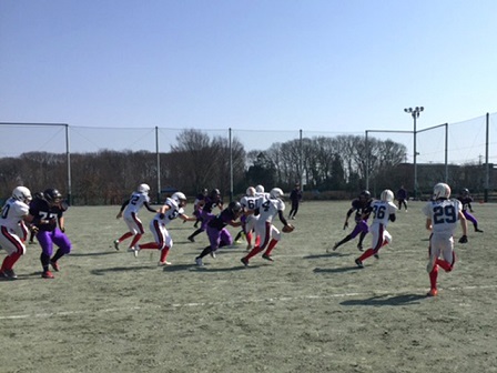 先日、聖望学園と練習試合をさせていただきました。普段はボールをキャッチするWR(ワイドレシーバー)として試合にでていますが、怪我で負傷した先輩の代わりに、自分は司令塔であるQB(クォーターバック)として試合にでました。どちらのポジションでも出られるように、常に練習してきましたが、やはり1年生で司令塔というポジションは責任が重く、不安を感じざるを得ませんでした。しかし、試合を通して、自分たちの作戦(アサイメント)が、相手を混乱させ、騙し、きれいに決まったとき、不安よりも楽しさが大きくなっていくのを感じました。