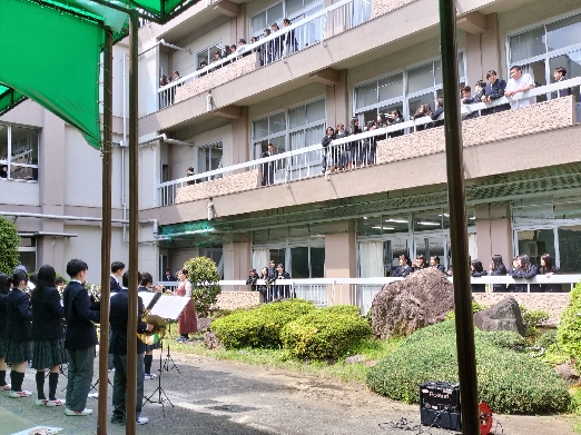 昼休みのひととき、校内に華やかな吹奏楽の音色が響き渡りました。新入生歓迎および新入生勧誘の一環として、中庭で吹奏楽部によるミニコンサートが行われました。生徒たちは軽快な演奏に誘われ、教室の窓辺やベランダ、廊下、そして中庭など、思い思いの場所から軽快なリズムに聴き入っていました。リズムに合わせて手拍子も広がり、会場が一体感に包まれました。