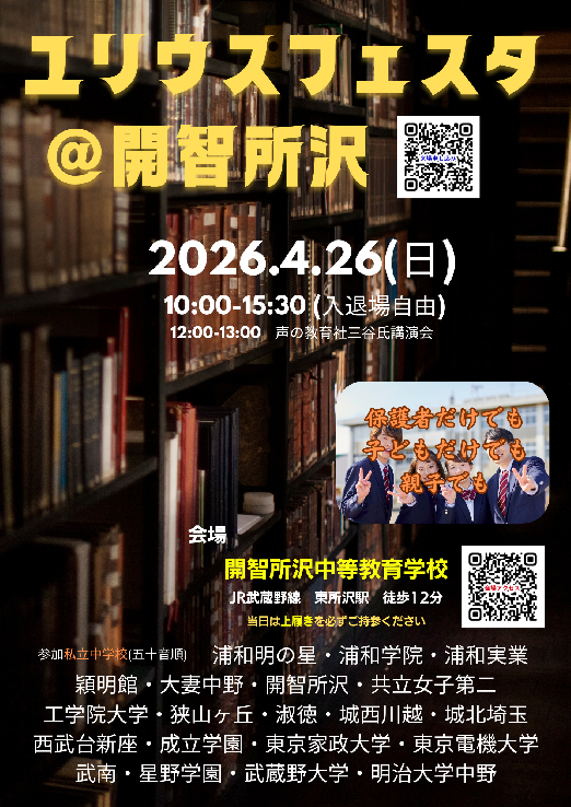 開智所沢中等教育学校にて、「ユリウスフェスタ私立中学 合同説明会・相談会」が4月26日(日)に開催されます。本校の教育内容や学校生活について、直接ご相談いただけます。ご来場の場合には、事前予約が必要になりますので、下記よりお申し込みください。皆様のご来場を心よりお待ちしております。