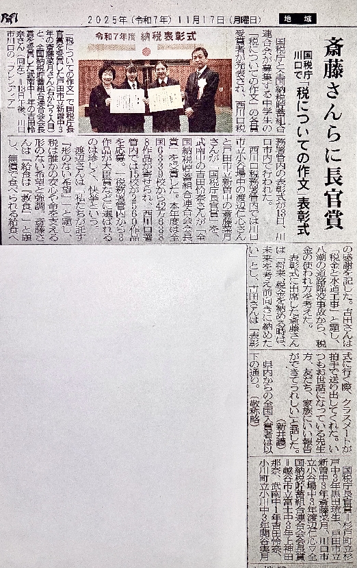 中学一年生の吉田玲奈さんが、本年度の「税に関する高校生の作文」コンクールにおいて、全国貯蓄組合連合会会長賞を受賞しました。
