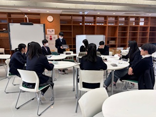 訪問後は、中学1年生から高校2年生までがグループに分かれ、中学生が「売りたい作品」についてプレゼンテーションを実施。高校2年生は司会進行を担当し、発表への感想やアドバイスを伝えるなど、異学年交流を通じて作品の魅力を言葉で表現する力を磨きました。