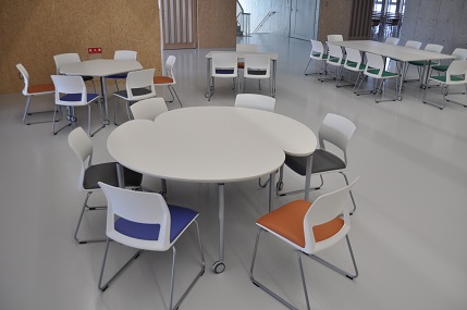 ラーニングコモンズにはさまざまな形をした机が置かれています。
