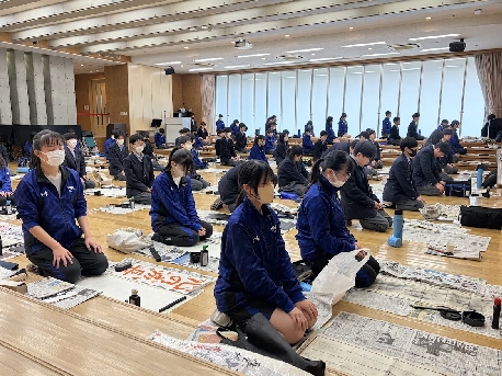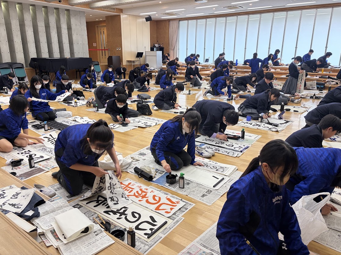 全クラスがメディアホールに集まり、落ち着いた雰囲気の中で一筆ずつ集中して取り組む姿が見られました。生徒たちは、平仮名と漢字のバランスや、滑らかな文字のつながりを特徴とする行書の書き方を意識しながら、心を込めて字を書いていました。最初は苦戦していた様子もありましたが、次第にコツをつかみ、素敵な作品を仕上げることができました。